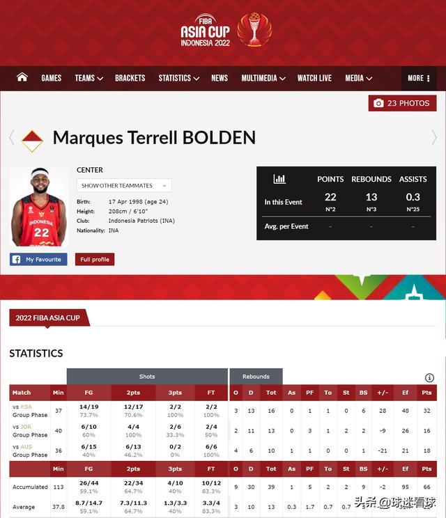 在代表盐湖城星光队出战NACC的比赛中,博尔登有着不错的数据,上赛季场均可以得到12.3分9.2板1断1.9帽的成绩单,随后被印尼方面看中,并被归化参加东南亚运动会,率队夺得金牌。从此,他一直跟随印尼出战,在之前的三场亚洲杯小组赛中,他场均要打37.8分钟的时间,场均砍下22分13篮板3个盖帽,对阵沙特一役怒轰32分16篮板6盖帽的超级大两双,堪称恐怖,具体技术统计如下图所示(截图自FIBA官网):